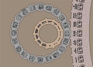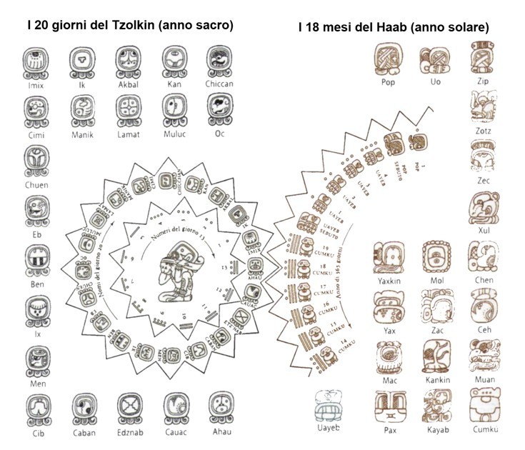 L’immagine mostra la struttura dei calendari Maya, evidenziando i due principali sistemi: Tzolk'in (Calendario Sacro) un ciclo di 260 gironi composto dalla combinazione di 13 numeri e 20 nomi di giorni. Era usato principalmente per rituali religiosi e divinatori.