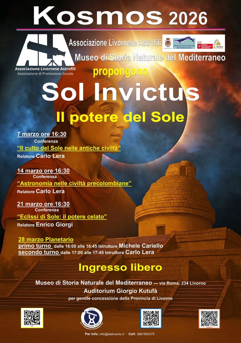 Con sabato primo marzo si conclude il ciclo di conferenze di “Kosmos 2025”. Ci sarà un’appendice con la visita, sabato 8 marzo, al Planetario con due turni. L’associazione Livornese Astrofili (A.L.A.) ringrazia tutti i cittadini livornesi per l’entusiasmo e l’interesse dimostrato con la loro grande partecipazione alle tre conferenze rendendo sempre al completo la sala Auditorium Giorgio Kutufà concessa gentilmente dalla provincia di Livorno. Senza ombra di dubbio A.L.A. si può ritenere soddisfatta dell’enorme successo di pubblico che “Kosmos 2025” ha suscitato. L’Associazione ringrazia la Provincia di Livorno e il Museo di Storia Naturale del Mediterraneo e la Sua dir.ce Dot.ssa Anna Roselli che hanno permesso lo svolgimento di “Kosmos 2025.
