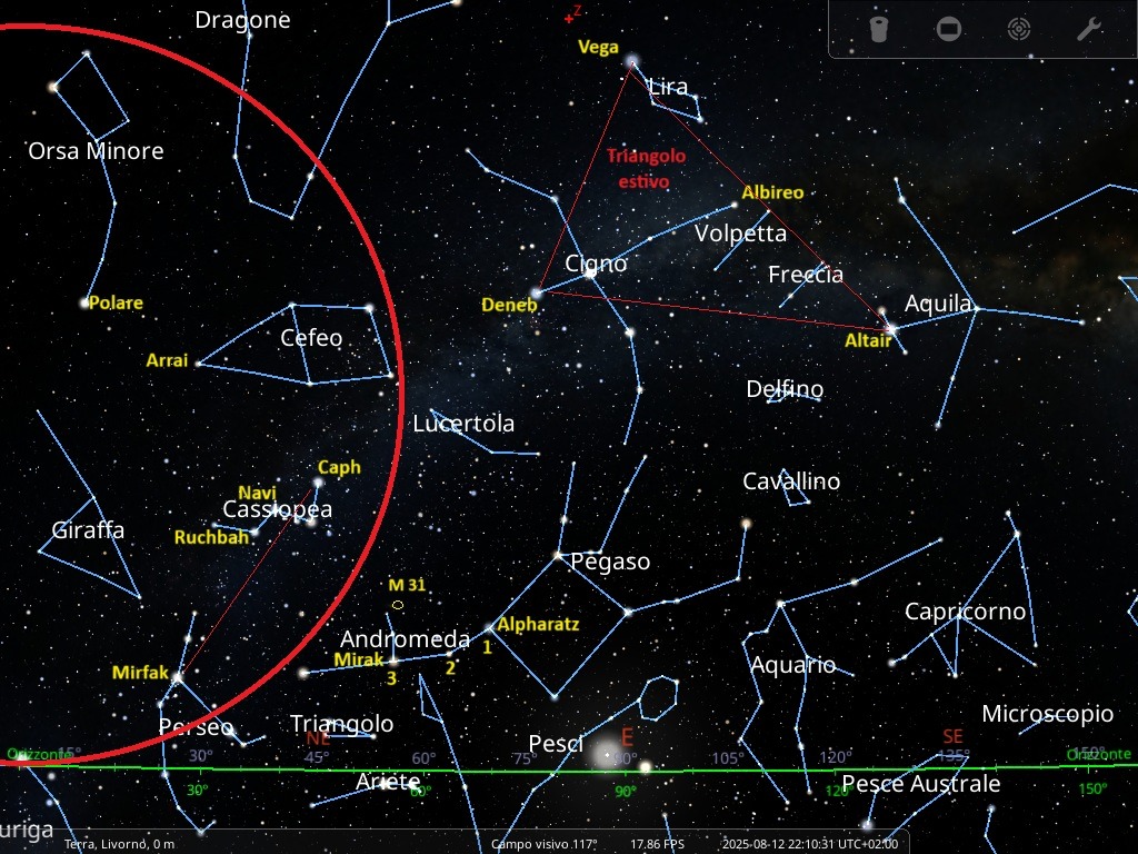 La carta celeste è orientata verso il quadrante Est, che in astronomia è più propriamente definito come Levante. È importante ricordare che questa rappresentazione è un’istantanea del cielo riferita alla metà del mese, alle ore 22:00. Rivolgendo lo sguardo verso Levante e osservando l’orizzonte — indicato dalla linea verde — possiamo individuare alcune costellazioni zodiacali. Sollevando gradualmente lo sguardo verso l’alto, raggiungiamo lo zenit, il punto esattamente sopra la nostra testa. Proseguendo oltre, il nostro sguardo compie idealmente una rotazione di 180°, fino a raggiungere l’orizzonte opposto: quello a Ovest. Come mostrato nella carta precedente, il cerchio rosso evidenzia le costellazioni circumpolari, sempre visibili nel cielo notturno. Il triangolo rosso, invece, è formato dai vertici di tre delle stelle più luminose del cielo estivo, dando origine al celebre Triangolo Estivo.