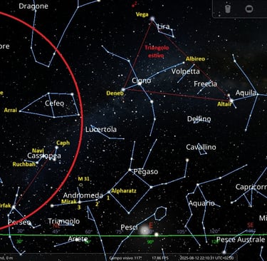 Ecco come orientarti nel cielo estivo di Livorno, usando allineamenti tra stelle per individuare facilmente le costellazioni principali: Triangolo Estivo È formato da tre stelle brillanti: Vega (Lira), Deneb (Cigno) e Altair (Aquila)
