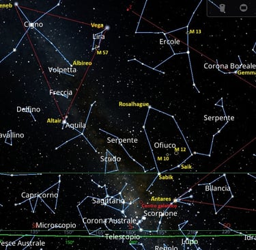 Se guardiamo lungo la linea dell’orizzonte, sempre verso Sud, noteremo facilmente una stella molto luminosa e rossastra: è Antares, il cuore dello Scorpione. Si trova appena sotto le chele della costellazione. Seguendo il corpo sinuoso dello Scorpione, arriviamo alla sua coda, che ci guida direttamente verso il Sagittario, un’altra costellazione zodiacale molto bella e ricca di significato. Proprio in mezzo a queste costellazioni passa la Via Lattea, e il suo centro è indicato da un piccolo cerchietto rosso. Se il cielo è limpido e privo di inquinamento luminoso, possiamo ammirare chiaramente gli asterismi di molte costellazioni zodiacali visibili in questo periodo. Per trovare Ofiuco, possiamo usare Antares come punto di partenza e tracciare idealmente una linea fino a Vega, una delle stelle più brillanti del cielo estivo. Lungo questo percorso, la prima stella luminosa che incontriamo è Sabik, che rappresenta l’inguine destro di Ofiuco. E per individuare Ercole? È semplice. Partiamo dalla stella Arturo, che appartiene alla costellazione di Boote. Arturo è facile da riconoscere: è molto luminosa e si trova seguendo la curva della coda del Grande Carro, cioè l’Orsa Maggiore. Una volta trovata Arturo, immaginiamo di tracciare un segmento: incontreremo prima Gemma, la stella più brillante della Corona Boreale, e proseguendo lungo quella linea, passeremo attraverso il quadrilatero che forma la costellazione di Ercole.