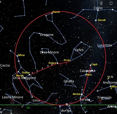 Una volta individuato il Carro dell’Orsa Maggiore, piuttosto facile da riconoscere grazie alle sue sette stelle luminose, possiamo iniziare a orientarci nel cielo notturno. Questa costellazione forma un quadrilatero con una coda composta da tre stelle leggermente angolate, con Mizar al centro della coda. Per trovare la stella Polare, dobbiamo concentrarci sulle due stelle anteriori del quadrilatero, chiamate Dubhe e Merak. Immaginiamo un segmento che le unisce e prolunghiamolo nella direzione Merak → Dubhe per circa cinque volte la distanza tra le due stelle. Alla fine di questo percorso, troveremo una stella solitaria e luminosa: è Polaris, l’ultima della “coda” dell’Orsa Minore, e indica il nord geografico. Se proseguiamo lungo la stessa direzione per altre due volte la lunghezza del segmento, incontreremo la stella Arrai, appartenente alla costellazione di Cefeo. Nella parte opposta rispetto al Carro dell’Orsa Maggiore, possiamo individuare un’altra costellazione facilmente riconoscibile: Cassiopea. La sua forma ricorda una lettera dell’alfabeto, una "W" o "M", a seconda dell’orario e del periodo dell’anno, ed è particolarmente evidente nei mesi autunnali. Da Cassiopea, possiamo tracciare una linea immaginaria partendo dalla stella Caph, scendendo parallelamente alla stella Navi, e proseguendo fino a incontrare una stella non molto luminosa ma visibile in quella zona del cielo: Mirfak, appartenente alla costellazione di Perseo. Questo metodo ci mostra chiaramente che, per individuare le costellazioni, è fondamentale partire da una figura riconoscibile o da alcune stelle di riferimento. Da lì, possiamo tracciare delle linee immaginarie che ci guidano verso altre costellazioni, come vedremo nelle carte successive.