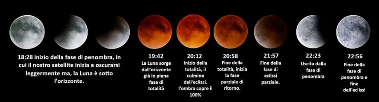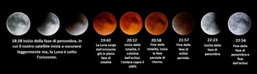 Questa immagine mostra il fenomeno dell’eclissi lunare totale, quando la Terra si interpone tra il Sole e la Luna, bloccando la luce solare diretta. La Luna entra nell’ombra terrestre, composta da due zone: la penombra, dove la luce è solo parzialmente oscurata, e l’ombra centrale, detta umbra, dove l’oscuramento è completo. Durante questa fase, la Luna assume una suggestiva colorazione rossastra, causata dalla rifrazione della luce solare attraverso l’atmosfera terrestre—lo stesso effetto che rende rossi i tramonti. Un vero spettacolo celeste, dove scienza e bellezza si incontrano.
