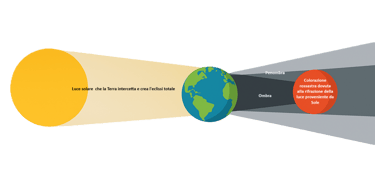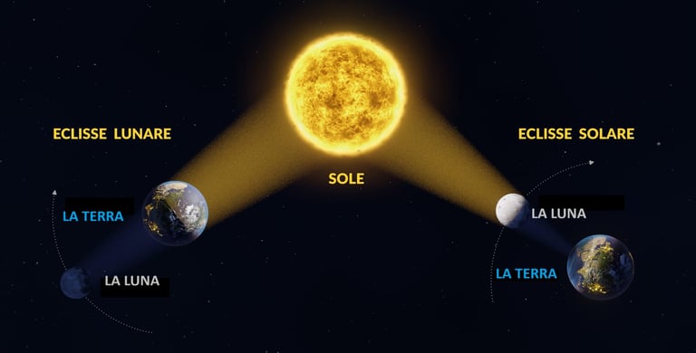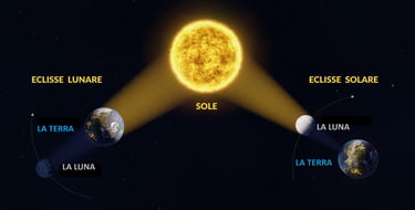 L’immagine illustra chiaramente la differenza tra eclissi lunare e l'eclissi solare. A sinistra, durante l’eclissi lunare, la Terra si interpone tra il Sole e la Luna, proiettando la propria ombra sul satellite naturale. A destra, nell’eclissi solare, è la Luna a posizionarsi tra il Sole e la Terra, oscurando parzialmente o totalmente la luce solare per chi si trova nella zona d’ombra. Due fenomeni spettacolari, generati da un perfetto allineamento tra Sole, Terra e Luna.
